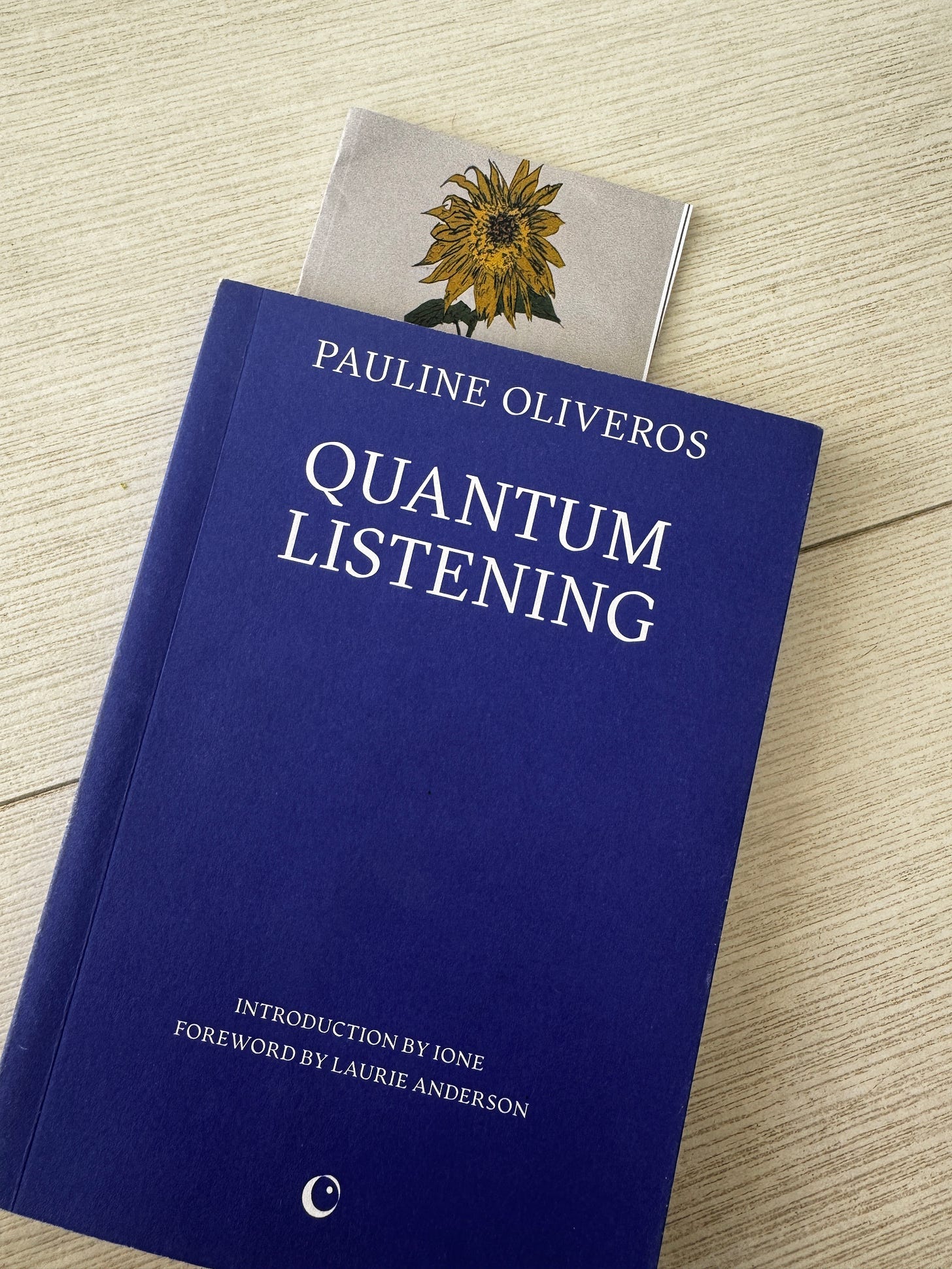 Sometimes, the most important books find you when you’re not looking. I came to Pauline Oliveros the old-fashioned way. After work, in Carin and Teamy’s office, I was winding down, not searching for anything. A small blue book on the desk caught my eye: Quantum Listening. Its simplicity - cover, title, and size - drew me in. I picked it up, read a few pages, and didn’t put it down for a while.