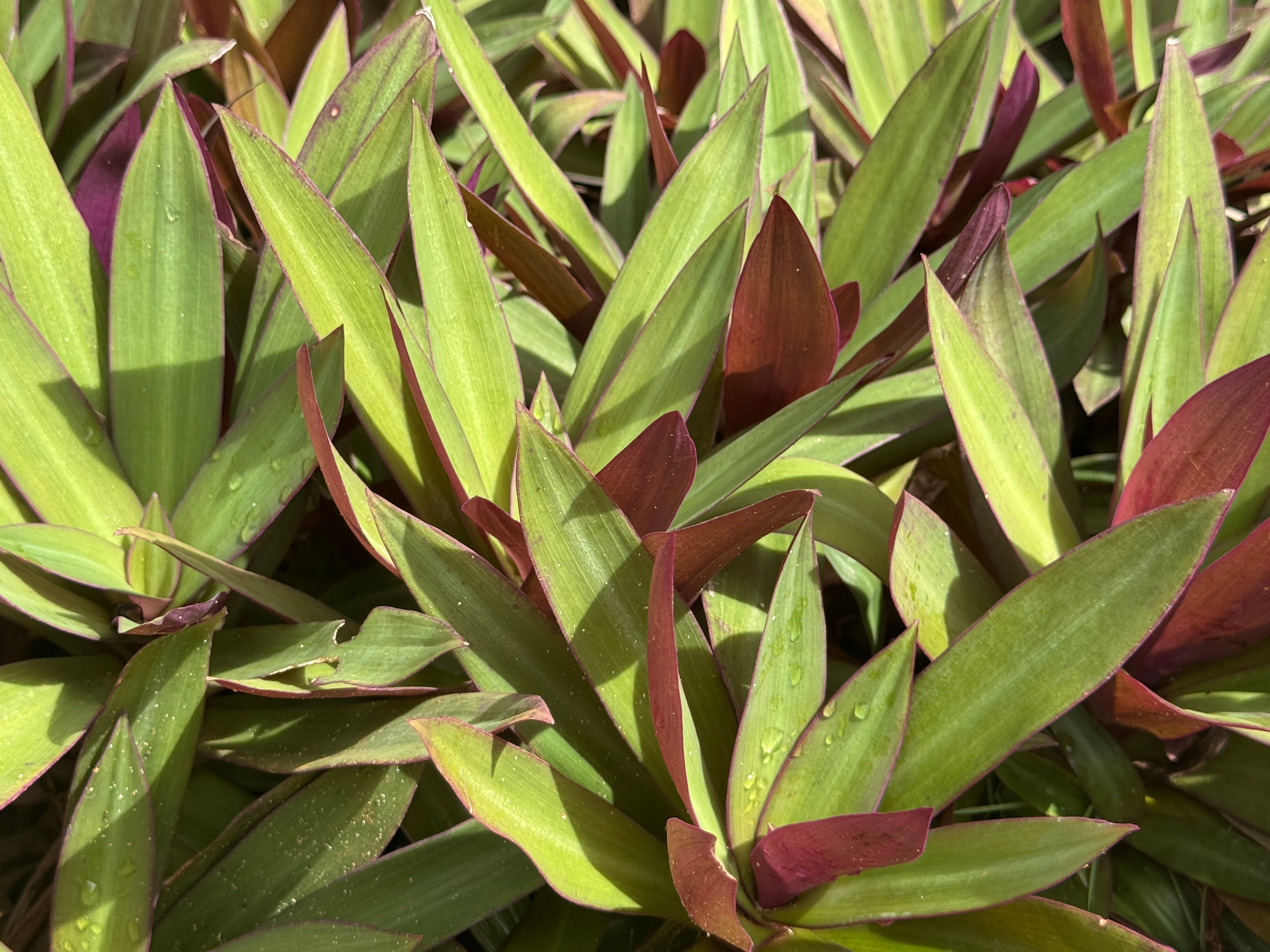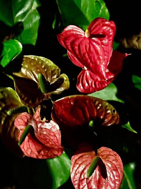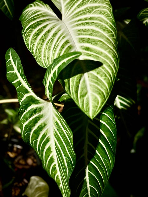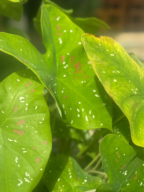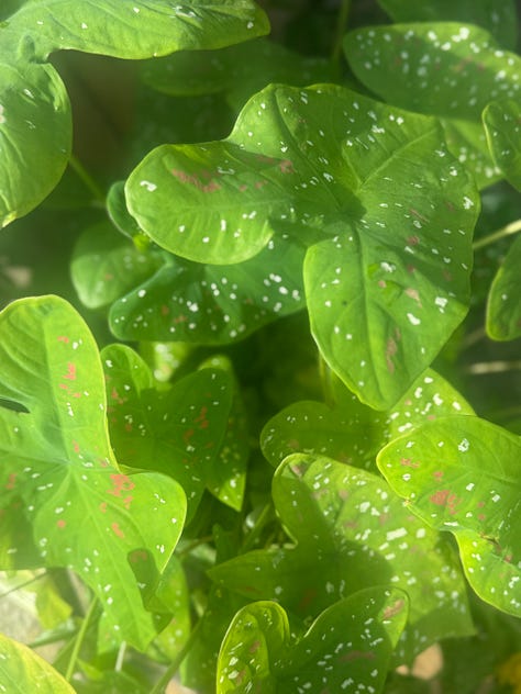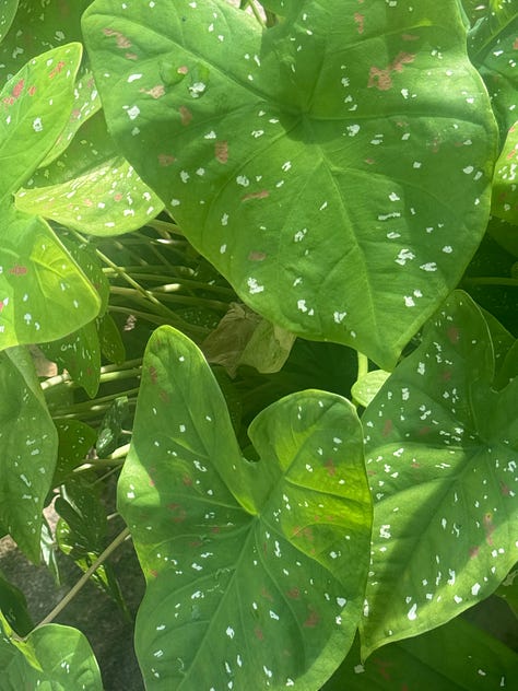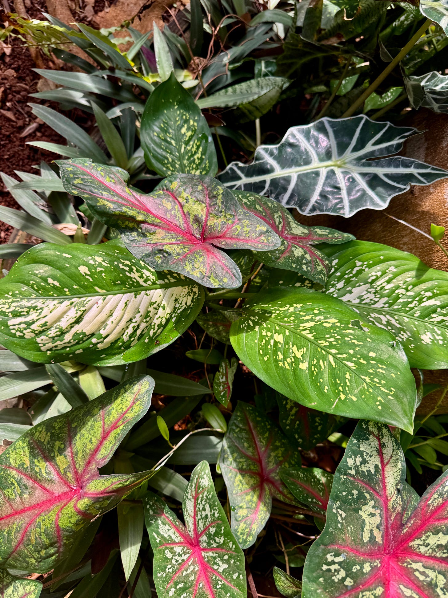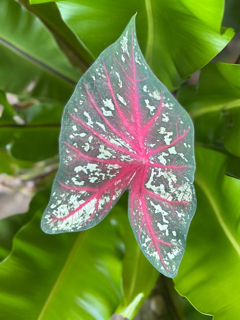 The caladium leaves unfurl like art, their patterns grown through patient years.