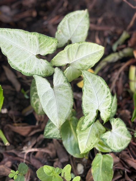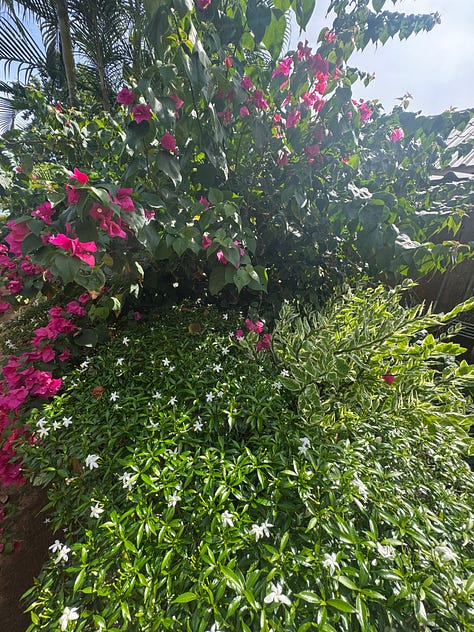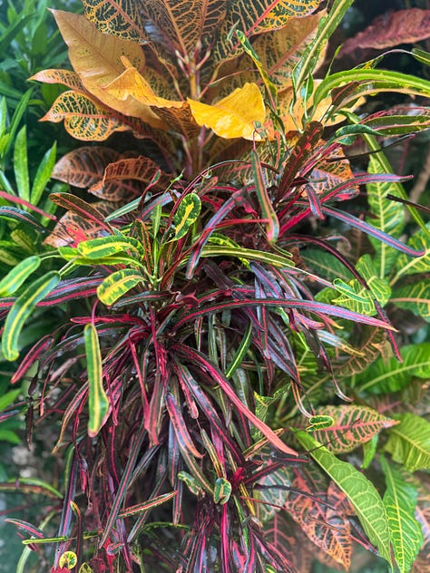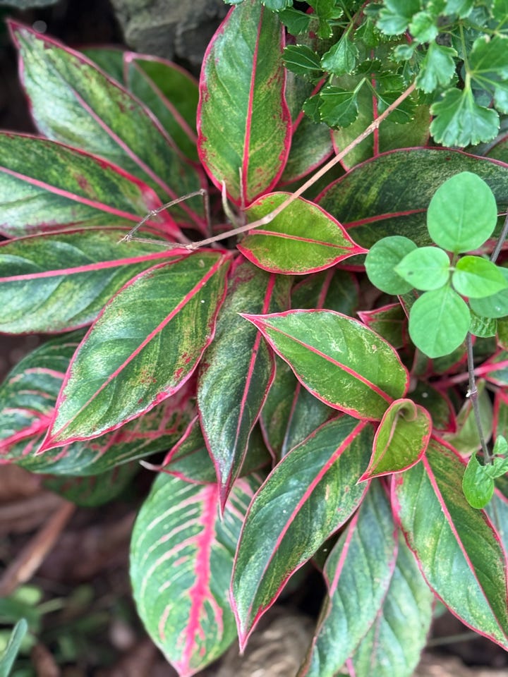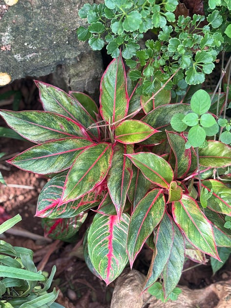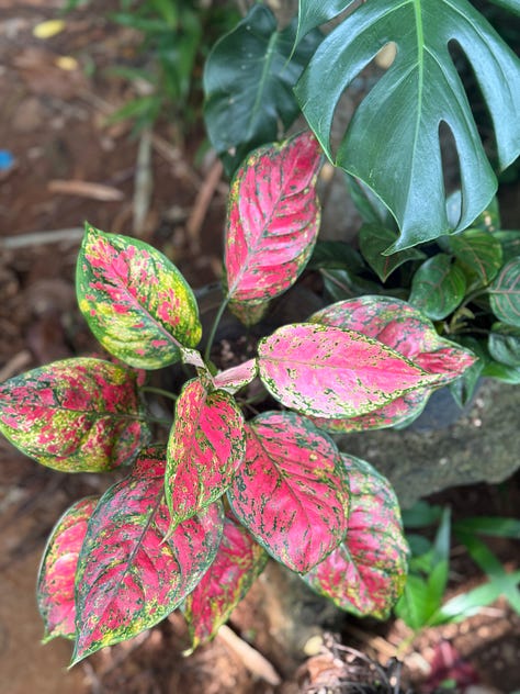 These are WILD plants. Heart-shaped leaves in combinations of pink, white, green, and red that look like someone’s been at them with watercolours. In temperate climates, you see them as expensive houseplants in fancy shops. Here, they’re just... growing. Everywhere. By the roadside, in gardens, under trees, absolutely thriving in the humidity.