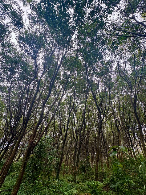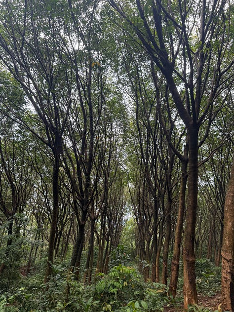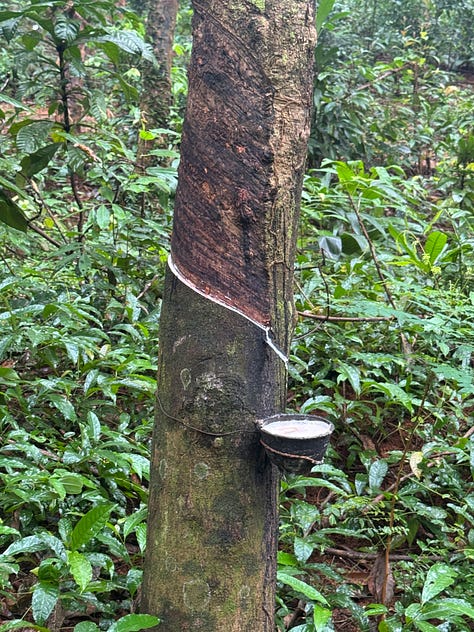 Seeing rubber tree plantations in action and the way they harvest them was super interesting. The trees are tapped like maple trees for syrup, except instead of sweet sap you get latex. They make diagonal cuts in the bark and attach little collection cups that slowly fill with this white, milky substance. The trees are arranged in neat rows, all at exactly the same angle (check one of the photos below for them all leaning quite heavily, presumably from the wind), all with their little cups attached. It’s oddly beautiful in an industrial-nature kind of way.