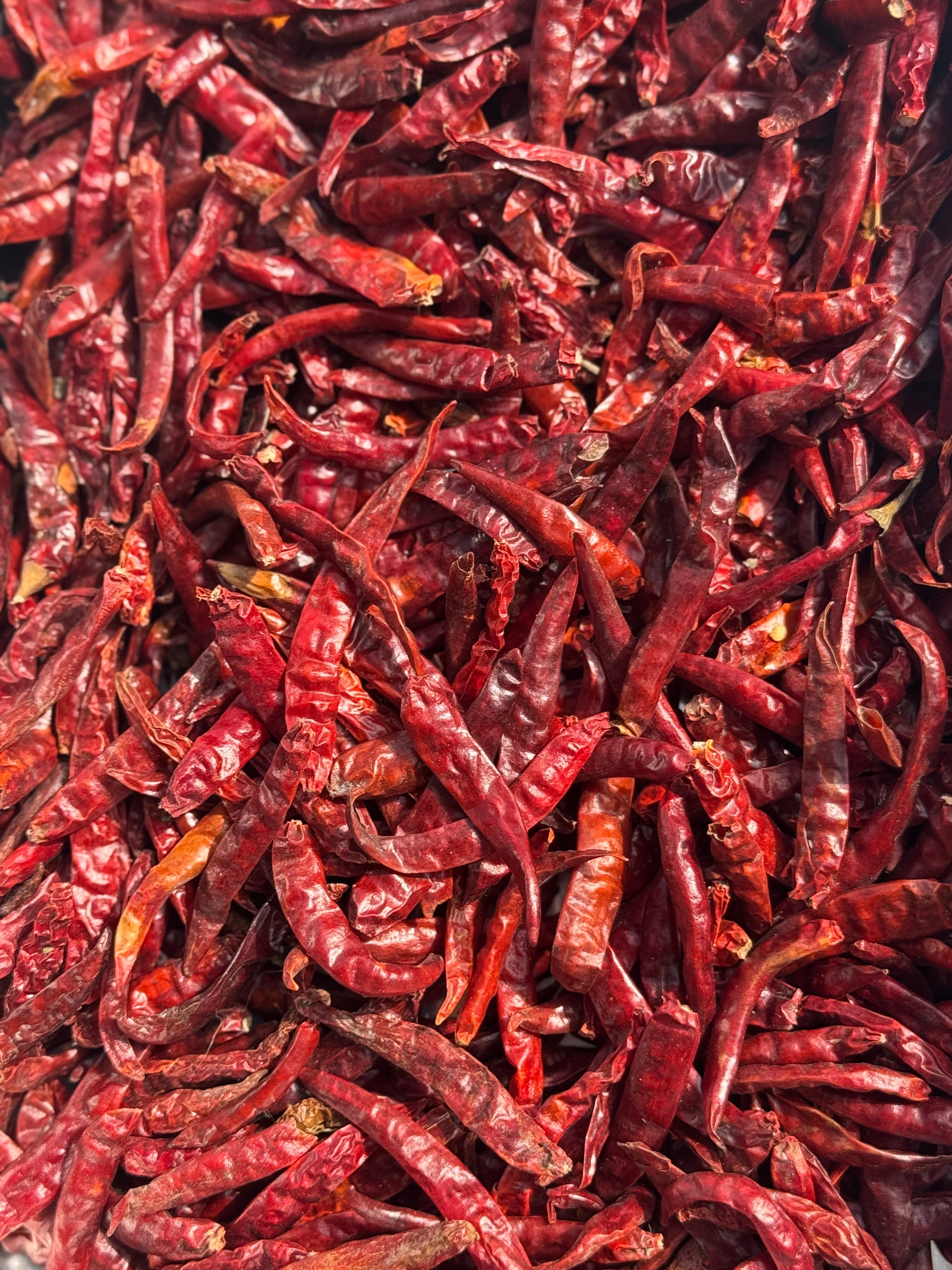 There’s something hypnotic about seeing chilies laid out to dry – these brilliant red strings and clusters, sometimes spread on mats, sometimes hanging from lines, all slowly intensifying in the sun. The colours are absolutely insane – that particular shade of red that only ripe chilies and certain sunsets can achieve.