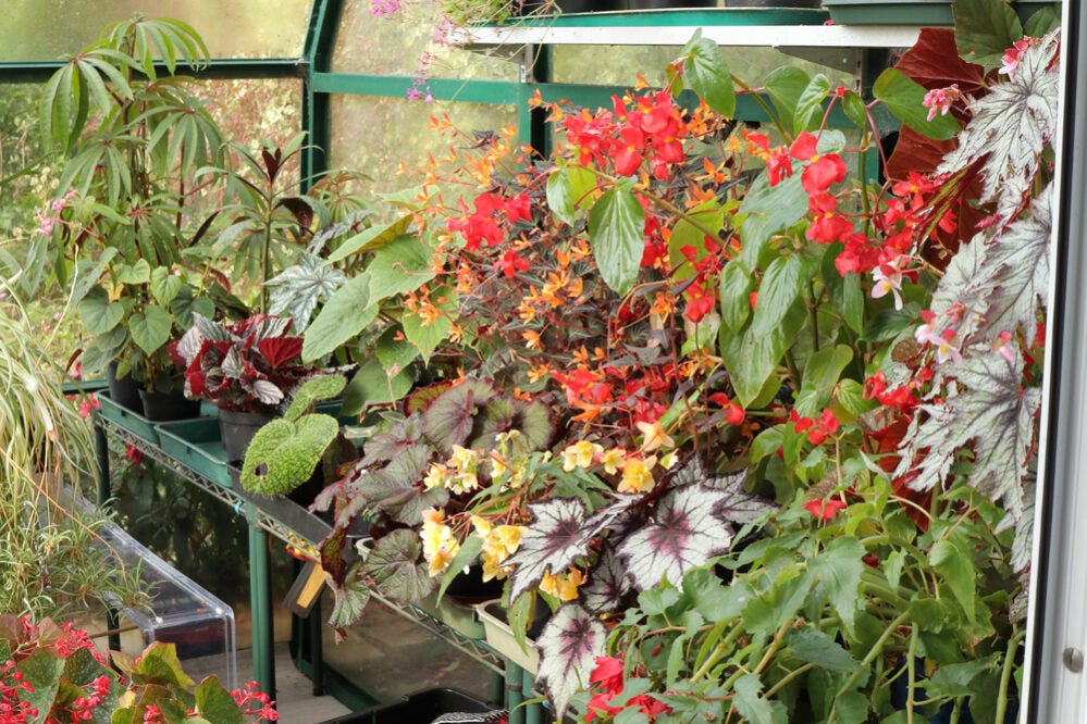 A conservatory full of Caladiums, Canna, Persian Shields, Rex Begonia, Amaranthus Tricolor, Purple Oxalis, Begonia Maculata, Fittonia, Calathea, Romanesco broccoli and a mix of Dahlias.