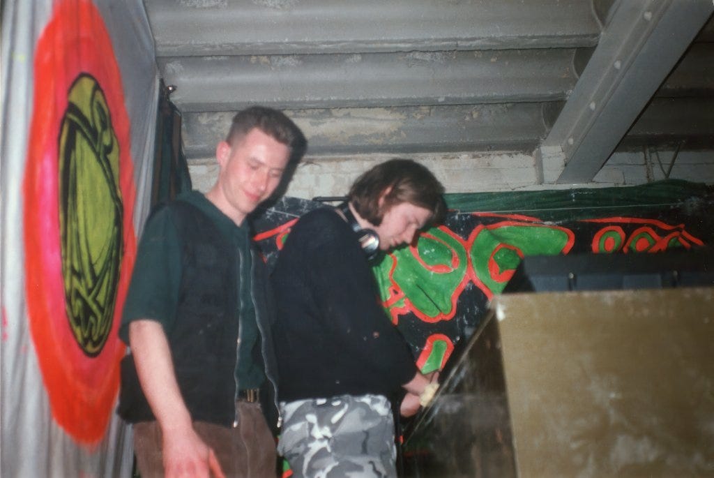 Kev, along with Chantal Passamonte (Mira Calix, RIP), David Vallade, and Mario Aguera, started in a shared house above a shop, with no neighbours to complain to or to bash the door down. What began as art school parties quickly grew into Sunday afternoon sessions in squatted venues – a former dole office in Brixton and even the derelict Roundhouse on New Year’s Day. They hosted everyone from Aphex Twin to Mixmaster Morris among wall-to-wall mattresses, UV installations, and Coldcut’s Matt Black with his boundary-pushing video projections.