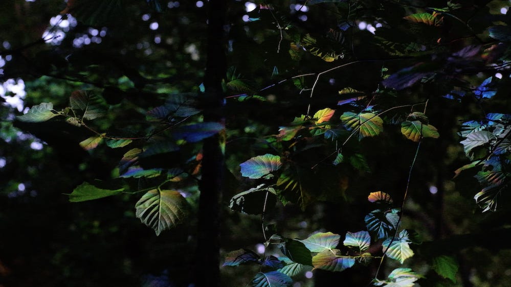 I was doing some special lighting for the Bush of Ghosts at Watching Trees which involved filming the daytime trees each day then projecting them back onto their evening counterparts through a load of prisms. The arty bullshit behind it is that it was trying to bridge the gaps of time and space and memory, creating past tense ghosts of the daylight. Using the projector as the one light source, the prisms split the beam into thousands of tiny rainbows all containing it’s own unique hue and personality alongside the essence of the original whole. It was inspired by the whole psychogeographic cut up tape drift animism forest sprite faerie kodama hauntological kinda thing but it also just looks pretty and I didn’t realy have to do much cus the trees and the sun have it all covered.
